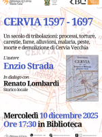 Nuovo appuntamento culturale nella sede della Biblioteca Comunale Maria Goia di Cervia (Circonvallazione Sacchetti 111). Mercoledì 10 dicembre 2025, alle ore 16,30, verrà presentato il libro di di Enzio Strada “CERVIA 1597-1697) Voraces et Bibaces” - Mangioni e beoni”, sulla storia di Cervia nel Seicento (Carta Bianca Editore 2025). L’autore dialogherà con Renato Lombardi, storico locale, e presenterà le novità emerse da un’approfondita ricerca in archivi cervesi, ma anche italiani e stranieri, che prosegue da vari anni. Federica Bosi, Assessora alla Cultura porterà il saluti dell’Amministrazione Comunale di Cervia.